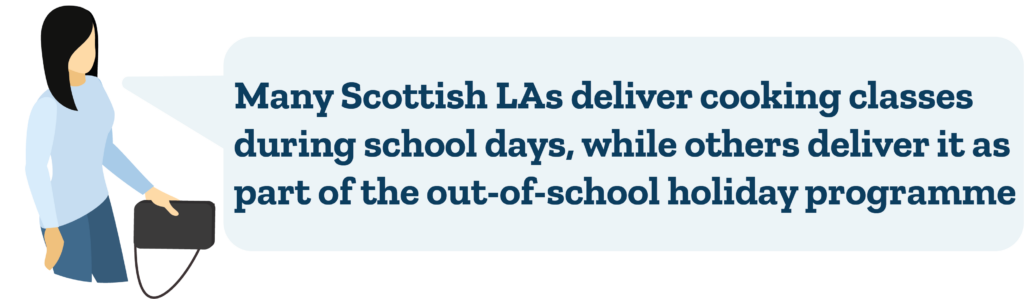 Some Scottish Local Authorities instead choose to deliver cooking classes as one part of the out-of-school holiday programme, in which students also take part in sports and crafts. Nicky explains, “Every day a group of pupils cook the meal for all the pupils attending the holiday programme, learning to make dishes they may not have tried before like macaroni cheese, chicken curry and lentil soup”. The young people that cook for their peers are proud of their achievement, and everyone is given the recipe alongside details of where to purchase fresh and cost-effective ingredients. As an alternative, schools could start a cooking club if cooking is not part of the curriculum, or to encourage the children who show a particular interest or talent in their cookery lessons.