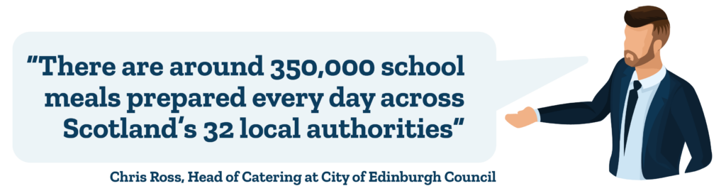 Following the introduction of universal free school meals for children in P1-P5, caterers in Scotland have been working hard to deliver more lunches than ever to school pupils. The Scotland School Meals Report found that 82% of pupils in Scotland had a school meal at least once a week, with 50% of them having school meals every day. According to Chris, that amounts to around 350,000 school meals across the country prepared every day across Scotland’s 32 local authorities.