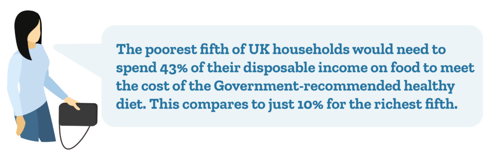 The report found that the poorest fifth of UK households would need to spend 43% of their disposable income on food to meet the cost of the diet outlined in the Government’s Eatwell Guide, which sets out what types of food and how much people should be eating to have a nutritious diet. This demonstrates that for many, a healthy diet is out of reach, and that the current system perpetuates the cycle of lower income being linked to poorer health.